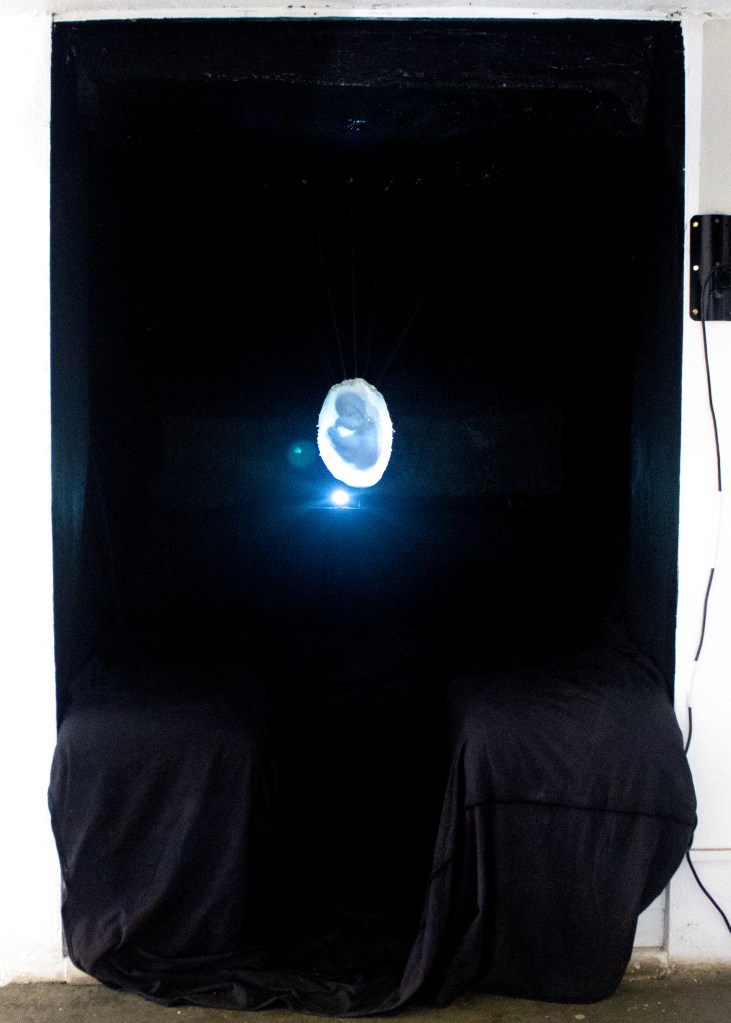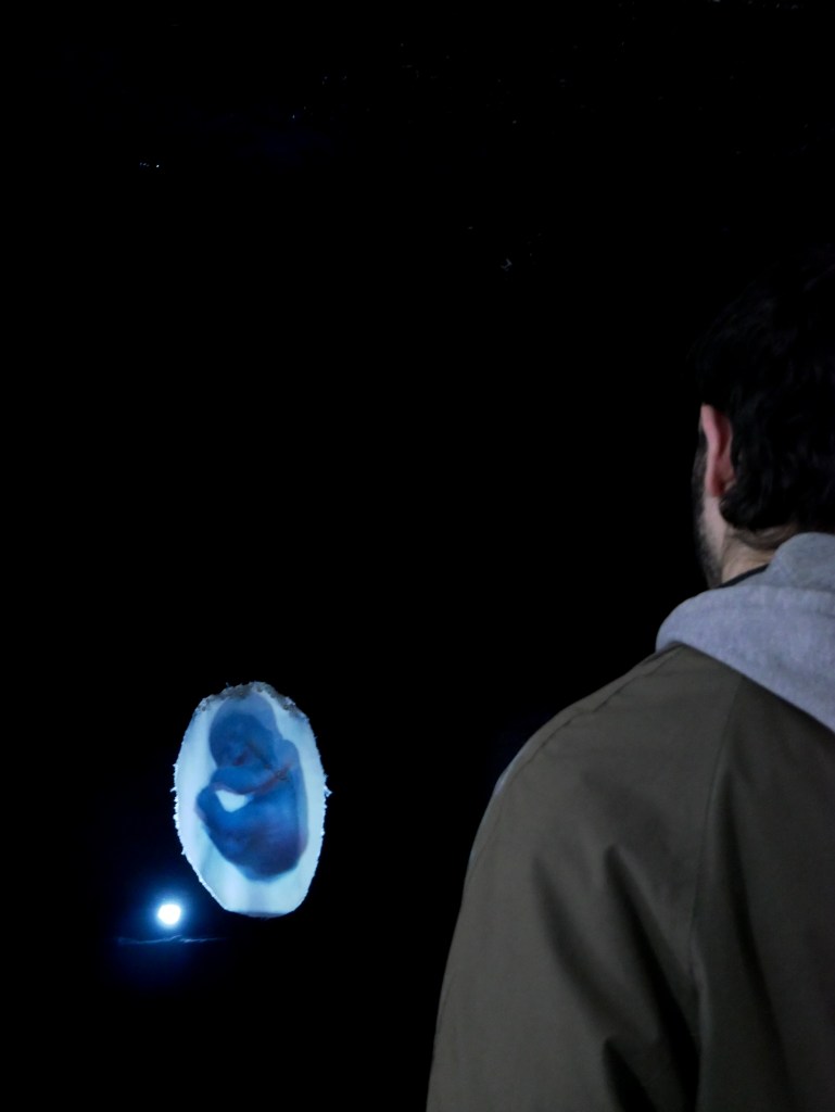 December 2023, cyanotype on silk-blend fabric, projected stop-frame animation with sound
