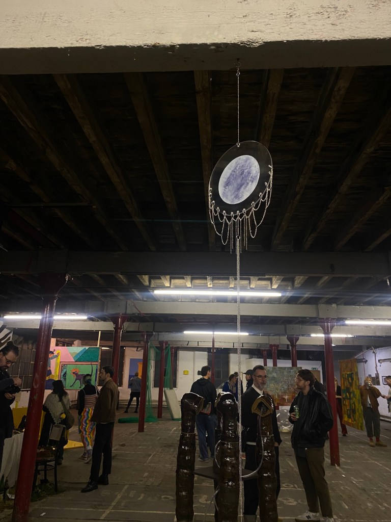 October 2025, cyanotype on paper, acrylic, metal chain & rings