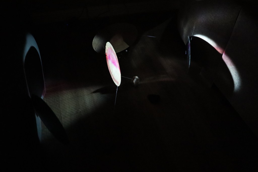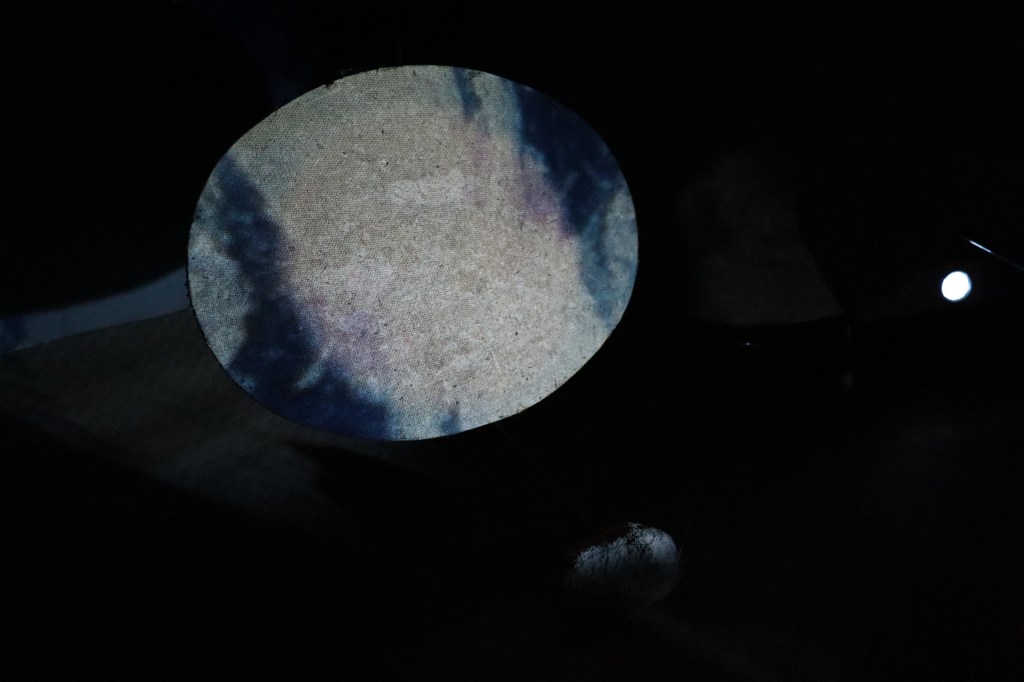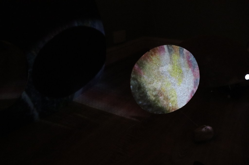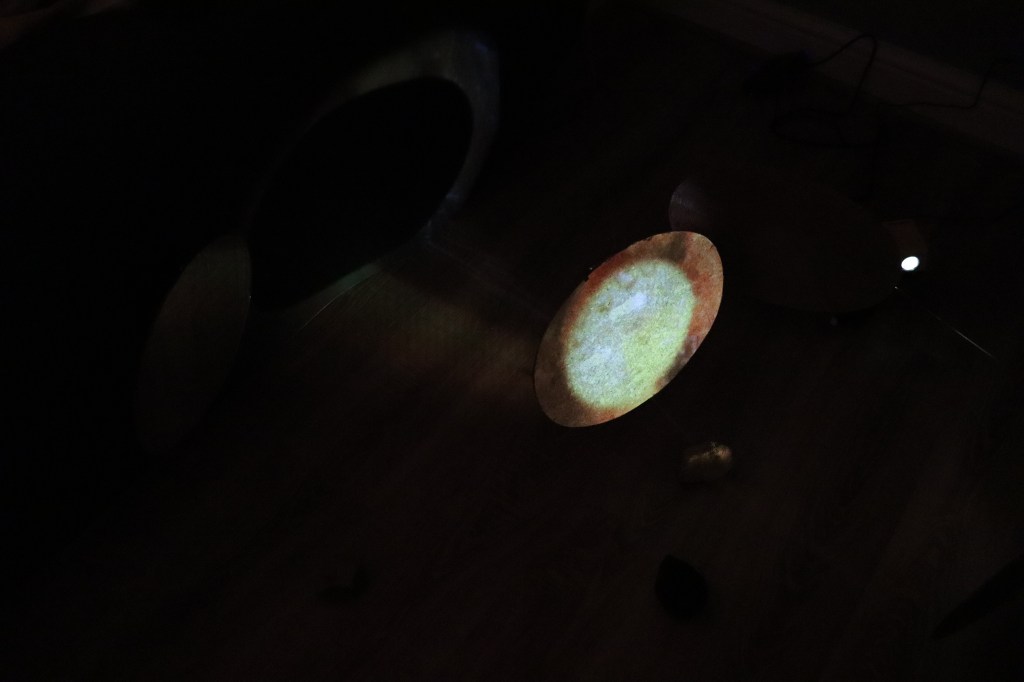Oval mirrors, oval cork boards, Yorkshire sandstone rocks, spatial video-drawing (projection) and sound.