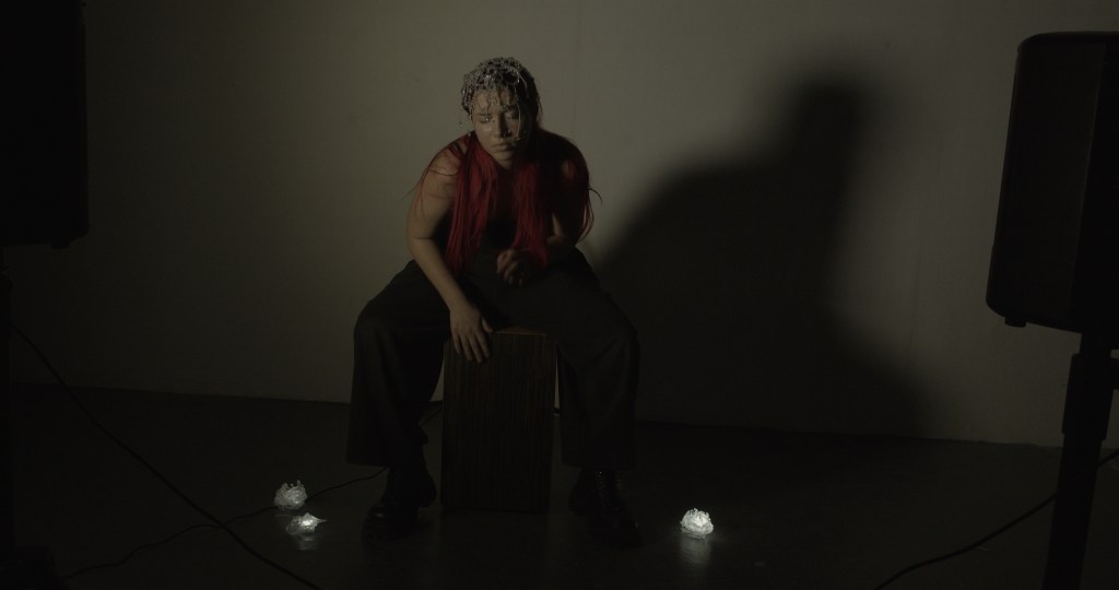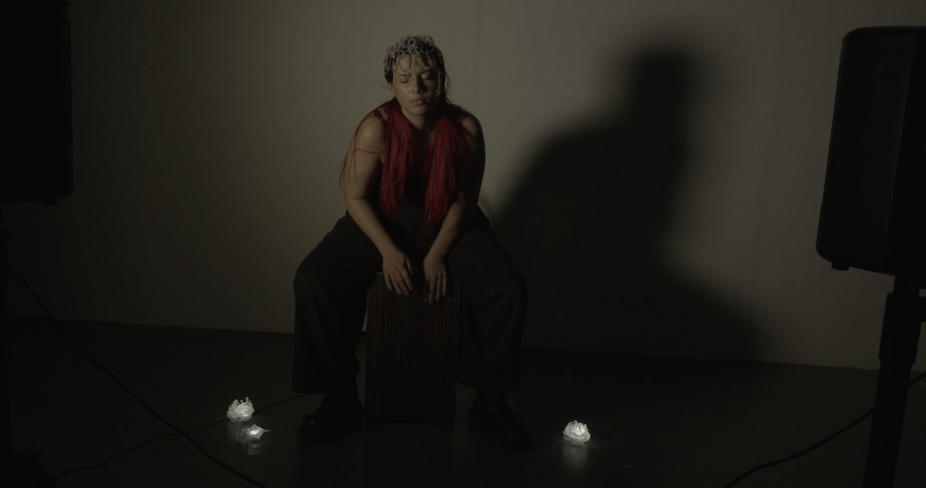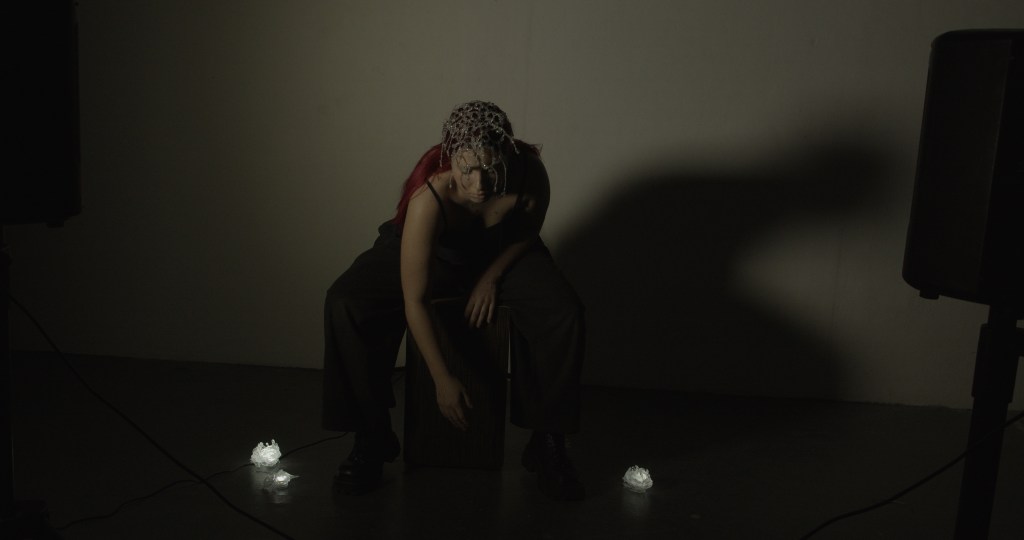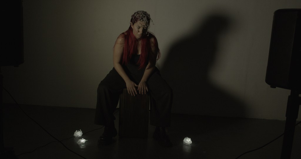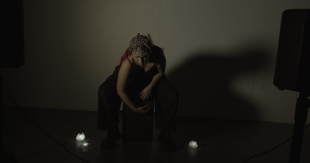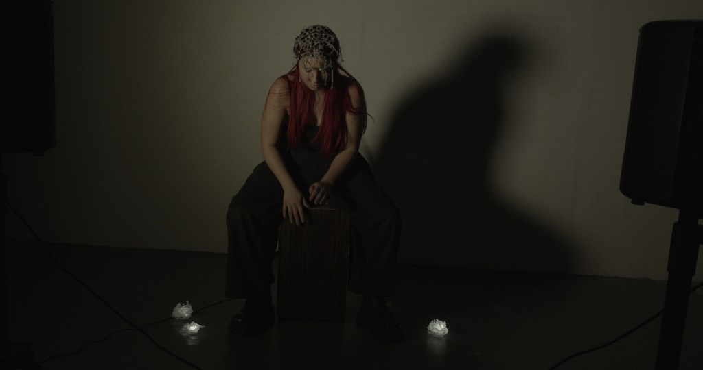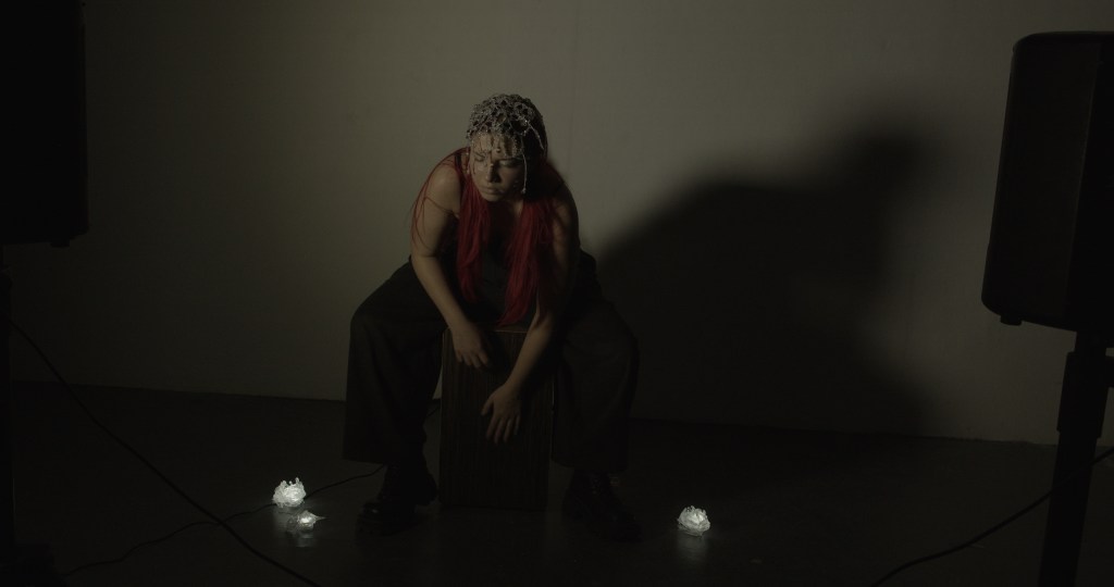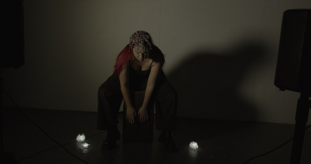 March 2023, Performance with cajon, sound piece, beaded head piece, resin and LED light sculptures, 10 minutes.