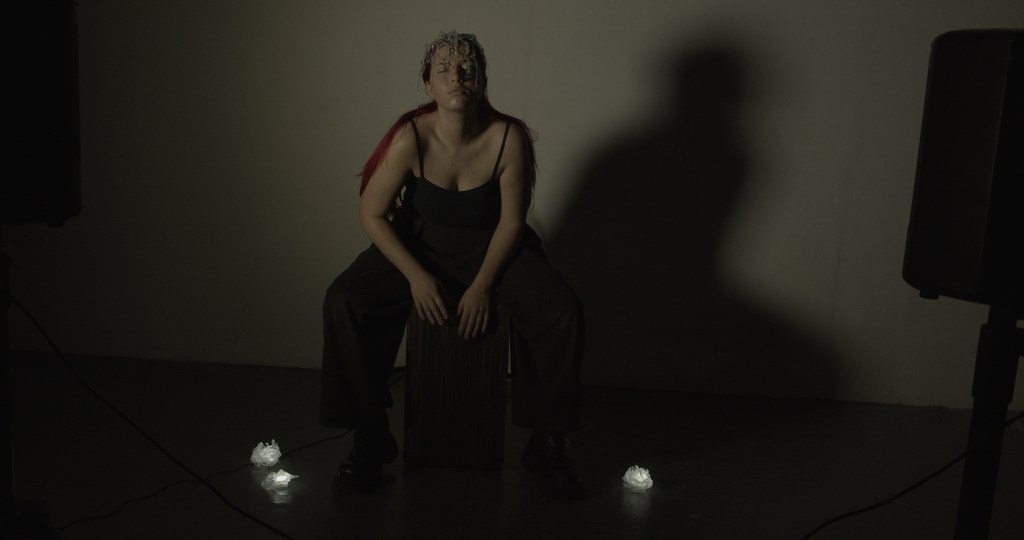 Exposing the struggle I have seeking my own flow, I express clashing rhythms as I piece together percussion sounds through my own movement and reaction to the sound piece. A trance-like environment is created, in my own mind and body, but also for the audience to experience. My own flow is extracted and dispersed to the world.